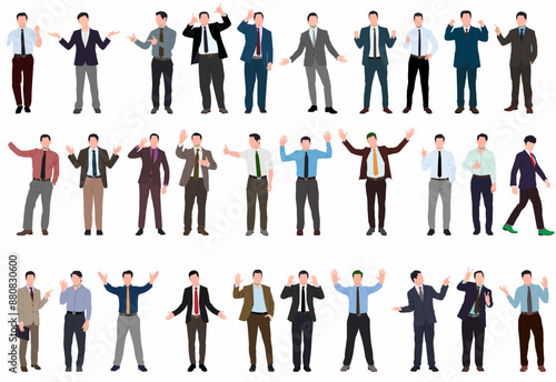 Businessman character in different poses. Handsome business man in formal suit standing, walking. Vector realistic illustration set.