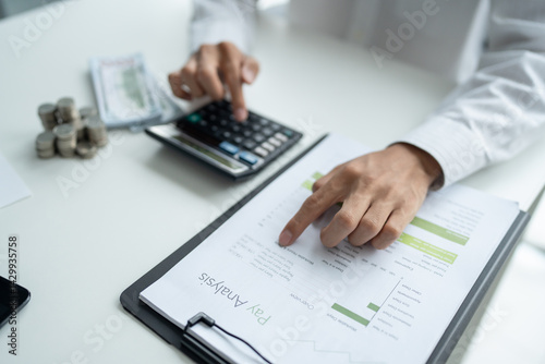 Businessman checking bills taxes bank account balance and calculating annual financial statements of company. Accounting Audit Concept