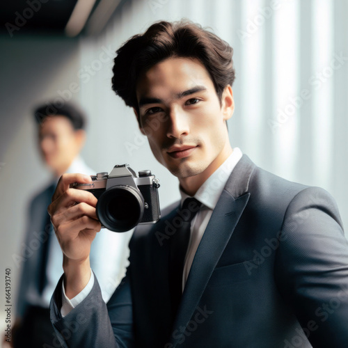 businessman confidently holds a camera in office, his demeanor exuding readiness to capture key moments and imagery within the office environment