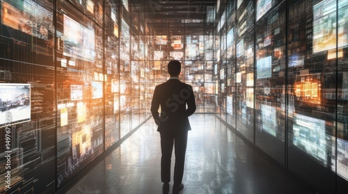 Businessman facing countless digital screens.