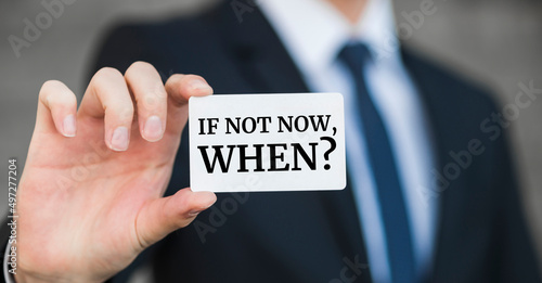 Businessman holding a card with text If not now, when