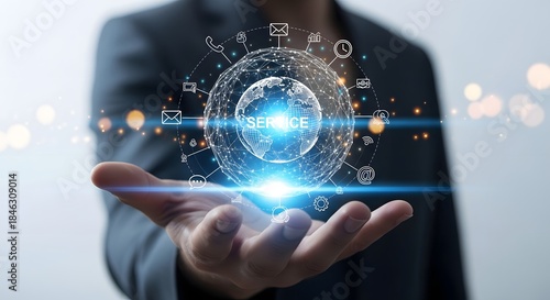 Businessman holding a glowing digital sphere representing global service network and technology concept