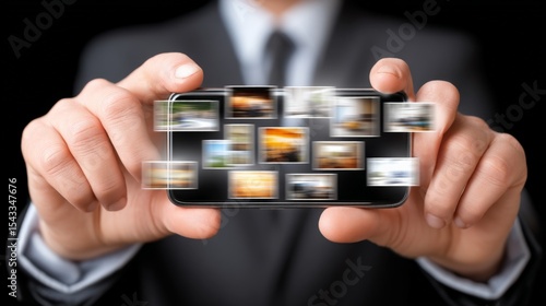 Businessman holding smartphone with multiple blurred images on screen, showcasing technology and communication