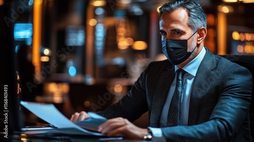 Businessman in a suit and mask working at a desk reviewing documents in a dimly lit office.