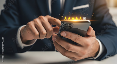 Businessman in Suit Giving Five Stars Rating on Smartphone, Showing Positive Feedback, and Service Quality Evaluation