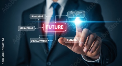 Businessman interacting with futuristic digital interface showing the word future
