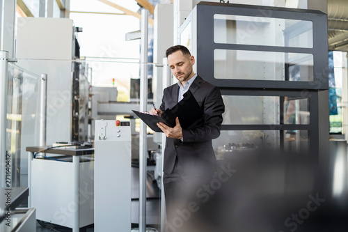 Businessman looking at folder in modern factory