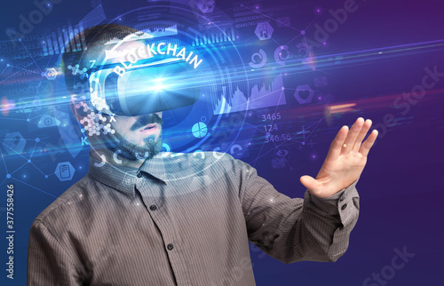 Businessman looking through Virtual Reality glasses with BLOCKCHAIN inscription, innovative technology concept