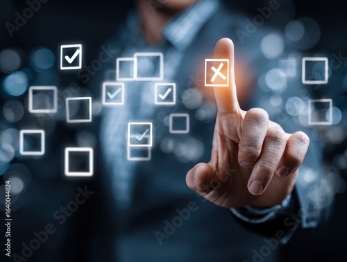 Businessman Making Reject Selection on Interactive Digital Approval System, Featuring Advanced Workflow Management, Decision Verification, and Professional Business Process Solutions