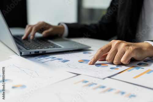 Businessman points to financial documents, he owns a startup company, he sits checking the company's financial summary prepared by the finance department. Management concept of startup company.