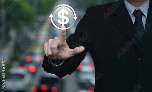Businessman pressing money transfer flat icon over blur of rush hour with cars and road in city, Business currency exchange service concept