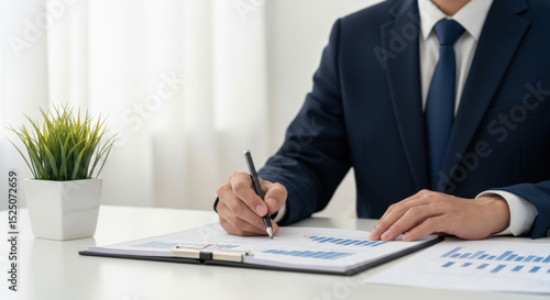 Businessman project plan strategy business growth. Analyze economic trend next year. Sustainable development. Office desk suit charts graphs. Corporate professional working. Financial report data.