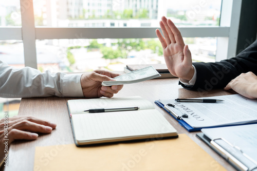 Businessman rejecting money or refusing money form of dollar bills to take the bribe to agreement contract, anti bribery and corruption concept.