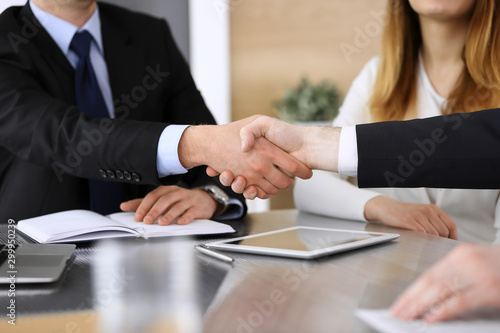 Businessman shaking hands with his colleague or partner above the glass desk in modern office, close-up. Unknown business people at meeting. Teamwork, partnership and handshake concept