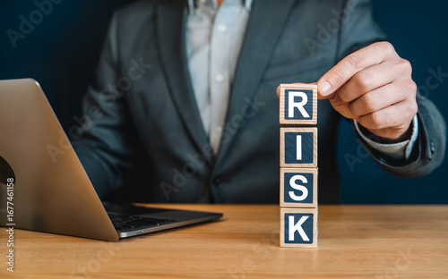 Businessman stacking "RISK" wooden blocks next to a laptop, symbolizing business management, strategic assessment, and financial planning.