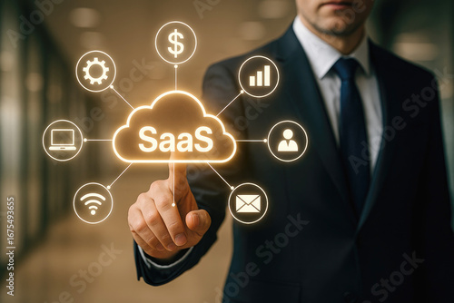 Businessman touching a glowing cloud icon with SaaS and surrounding business icons SaaS software as a service