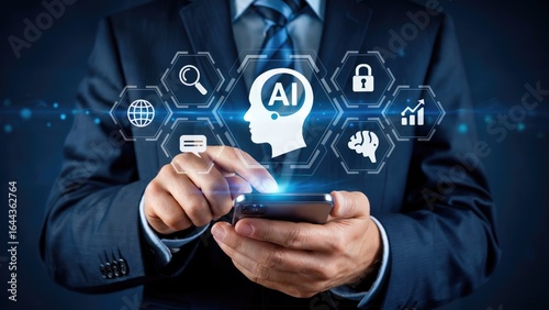 Businessman using AI technology on smartphone, exploring innovation and future possibilities