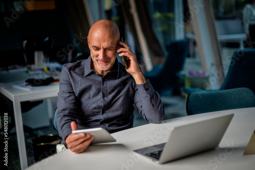 Businessman using diigital tablet and making a call while sitting in a modern office. Multitasking.