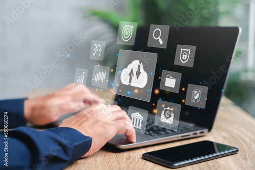 Businessman using laptop to document management and development concept,Online documentation database and digital file storage system on cloud computing diagram virtual screen and internet service
