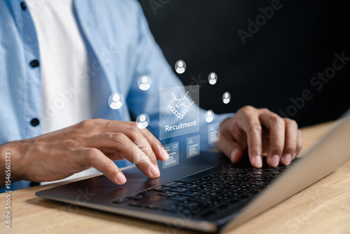Businessman using laptop with recruitment, resumes, and candidate profiles. HR technology, job application, and online hiring process concept in business.