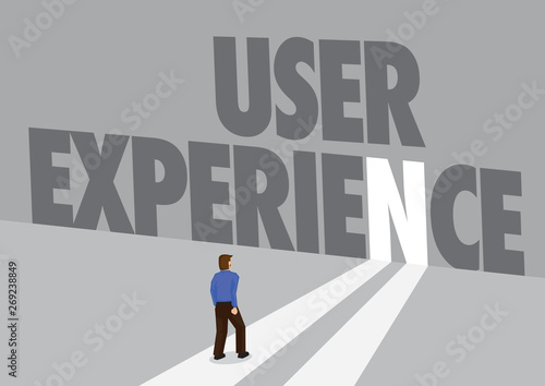 Businessman walking towards a light path with the text User Experience. Business concept of innovation, customer experience or usability. Vector illustration.