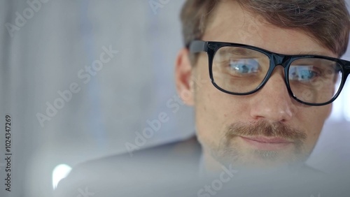 Businessman with glasses looking intently obscured partially by a translucent surface of laptop. Business concept