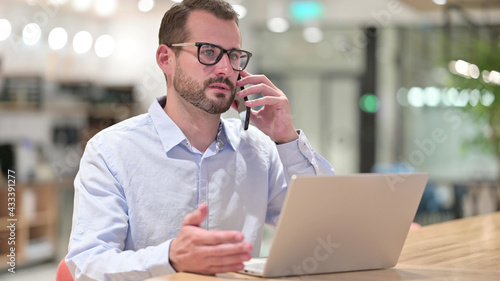 Businessman with Laptop Talking on Phone in Office