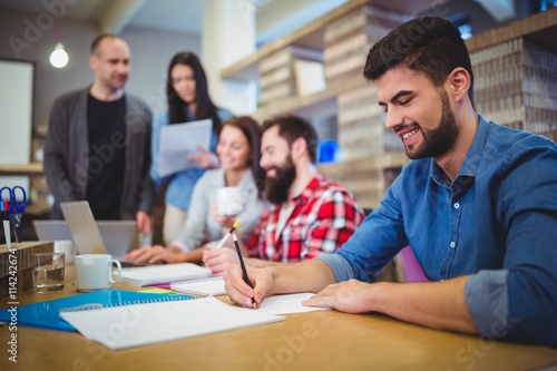 Businessman writing on paper while colleagues in background