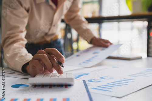 Businessmen hold graph pens and use a calculator for the company's improvement plan.