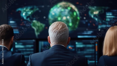 Businesspeople in an office with a network of screens showing global data, symbolizing business intelligence and networking, hightech and analytical
