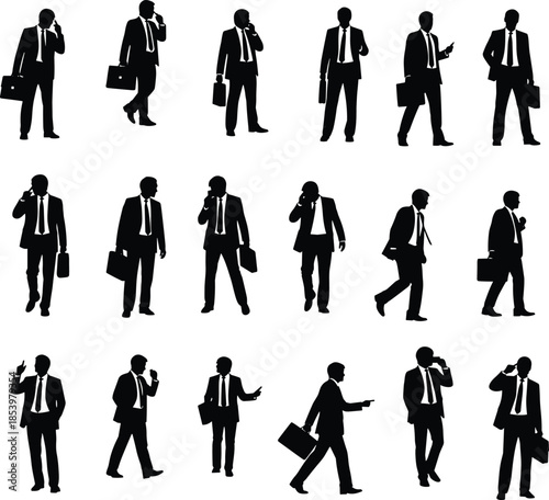 Businesspeople silhouettes, corporate professionals, office workers, suit and tie, mobile phone, briefcase, teamwork, communication, leadership, standing, walking, pointing