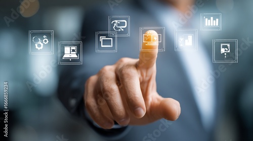 Businessperson's hand touching data icons to analyze information in a blurred office setting