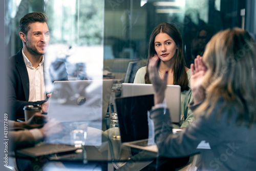 Businesswoman discussing with colleague while sitting in meeting at office