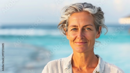 Businesswoman in her 50s, looking relaxed and elegant at a beautiful resort, in comfortable attire