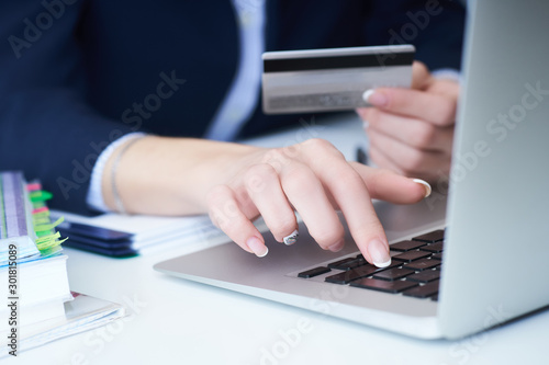Businesswoman inputting her password and login to carry out online banking operation on laptop pc in the office. Woman's hand holding credit card close-up.