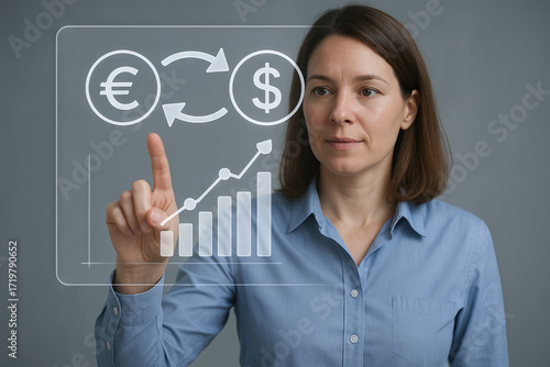 Businesswoman interacting with translucent currency exchange hud display featuring euro and dollar symbols and growth graph
