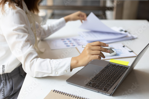 Businesswoman working on documents on laptop in office, business chart analysis in financial reports and financial investment planning, budget accounting.