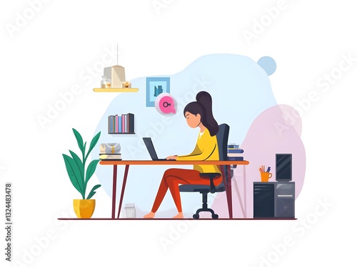 Businesswoman working remotely from home with a desk setup, female corporate employee executive working on laptop from home, work from home set up of a worker