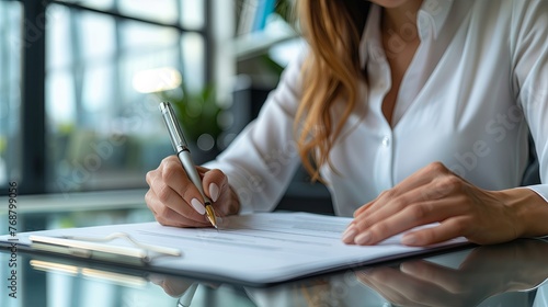 Busineswoman using pen signing, writting in office