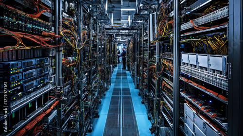 bustling data center filled with servers and engineers collaborating