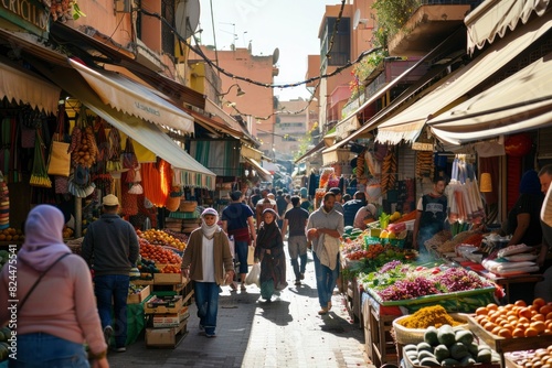 Bustling Market Street in Exotic Locale with Local Shoppers and Colorful Produce Stalls