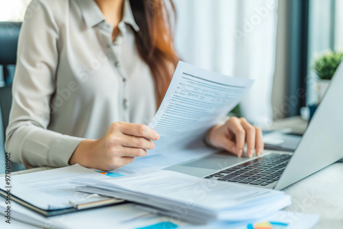 Busy 40 years old business woman working in office checking documents. Mid aged businesswoman accounting manager executive or lawyer using laptop reading paper file financial report, tax invoice
