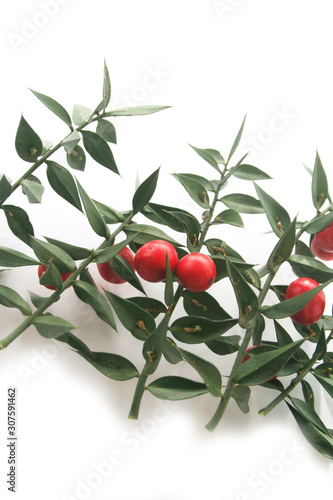 Butcher's Broom branches with ripe red berries isolated on white background. Ruscus aculeatus bush on white