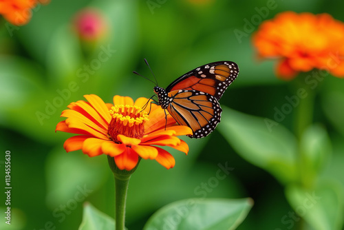 butterfly lands zinnia flower bright orange petals lush green garden setting delicate leafy