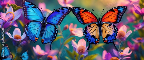 Butterfly with empty copy space for text amid colorful flowers