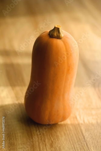 Butternut squash on the table, illuminated by sunlight. Selective focus.