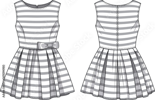 CAD drawing, flat sketch, striped dress, sleeveless design, vector illustration, bow belt, pleated skirt, fashion technical drawing, sewing template, apparel mockup, kidswear pattern