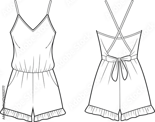 Cad drawing flat vector, romper fashion illustration, women’s clothing design, garment technical sketch, apparel template, outfit silhouette, black white line fashion drawing