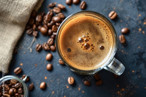 Caffeine Harmony: Indulge in the Harmonious Blend of Coffee Beans and an Espresso Cup, Captured in a Top View on a Rustic Table, Eliciting Aromatic Pleasure and Relaxation.