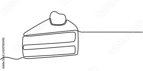 Cake Slice with Whipped Topping continuous one line drawing, Single one line drawing round chocolate cake with strawberry topping. One piece for loved ones first. Sweet and soft in mouth. National.